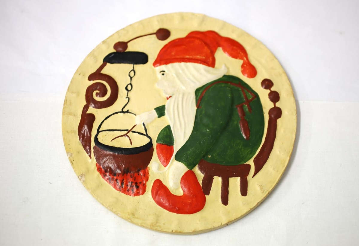 Veggmynd. Marglitur, kringlóttur platti með upphleyptri mynd af jólasveini sitja á stól og hræra í potti. Plattinn er frá ca. 1950 gerður af Guðbirni Hjaltasyni (?) málara á Eskifirði en kemur úr eigu langafa og langömmu gefanda, Óla Einarssonar og Margrétar Einarsdóttur er bjuggu í Þingmúla í Skriðdal 1912-1939. Skautmunur.