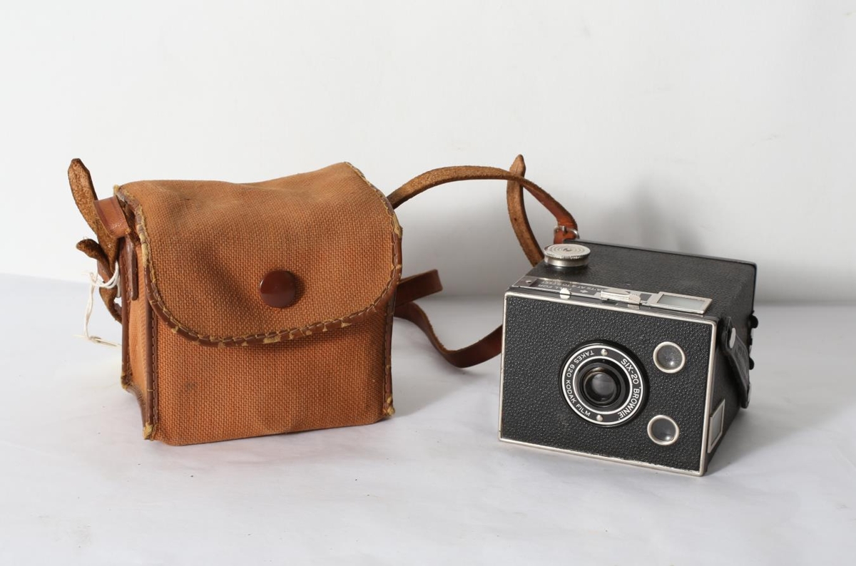 Gömul kassamyndavél af Kodak gerð, vel með farin og í brúnni strigatösku. Kom frá Höfða á Völlum.