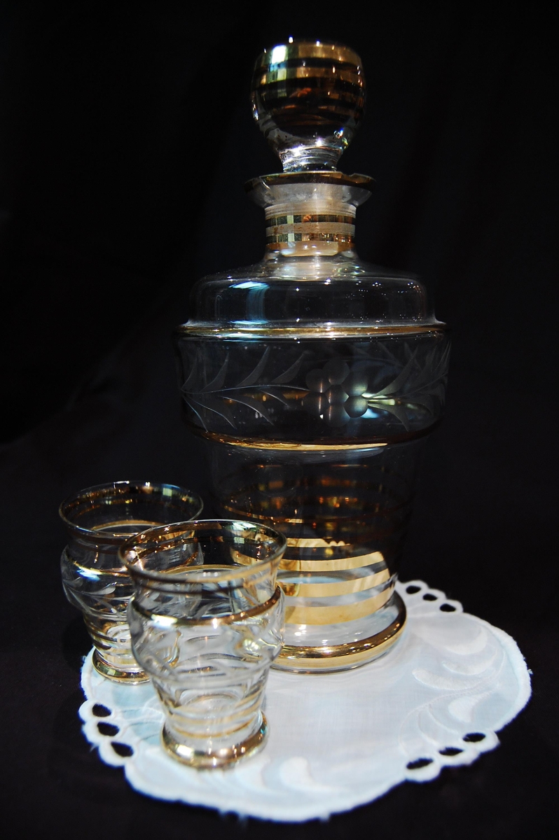 Vínflaska og glerstaup. Gylltar renndur og sandblásinn eða skorinn mynsturbekkur. Úr Hallormsstaðabúinu.