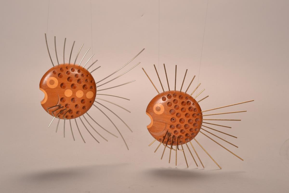 Fiskur úr tré og málmi til að hengja á vegg. Eftir Erling Jónsson