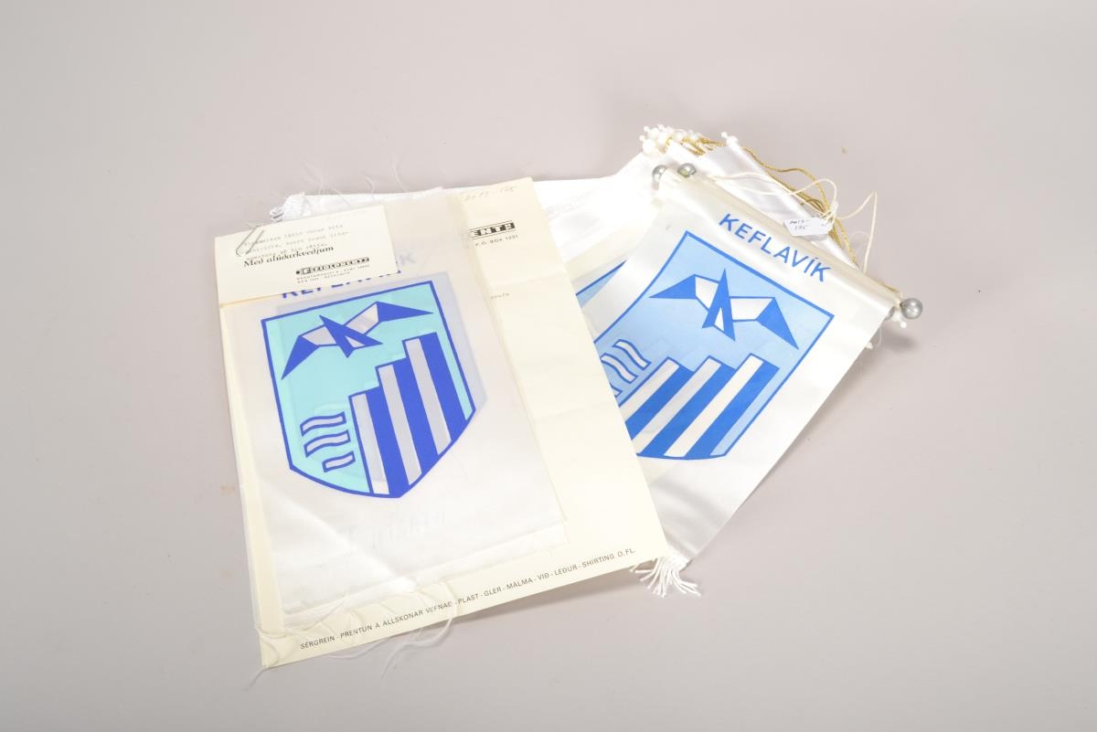 Borðfáni merktur „Keflavík“ og með merki Keflavíkurbæjar. Þrjár gerðir. Úr silkikenndu efni, blátt merki og stafir á hvítum grunni. Með hvítu kögri að neðan.