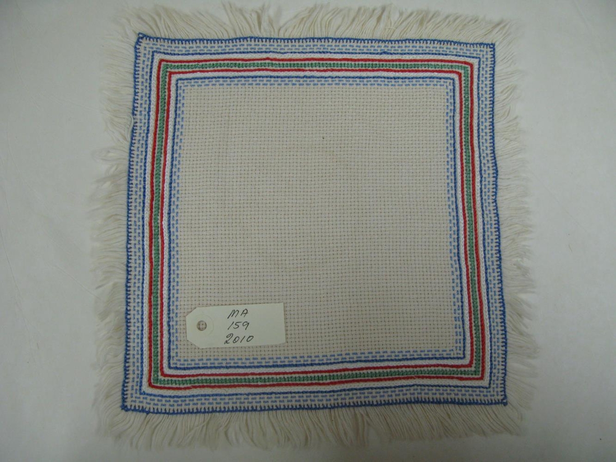 Lítill dúkur, sem var handavinnuprufa og skyldustykki í unglingaskólanum á Eskifirði árin 1960 - 1970. Ýmsar saumagerðir. Gefandi var ca 13-14 ára þegar hún gerði þetta og þá var handavinnukennari Elín Ósk Óskarsdóttir, eiginkona Kristjáns Ingólfssonar skólastjóra.