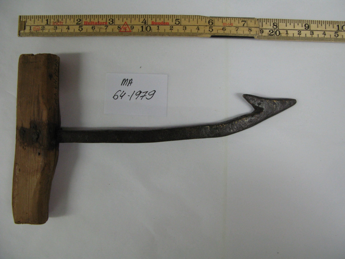 Heimasmíðað heyjárn, lítið með tréhaldi. Haldið er klofið eftir endilöngu. Úr búi gefanda, Aðalbjargar Pétursdóttur og manns hennar Eiríks Péturssonar frá Bót.