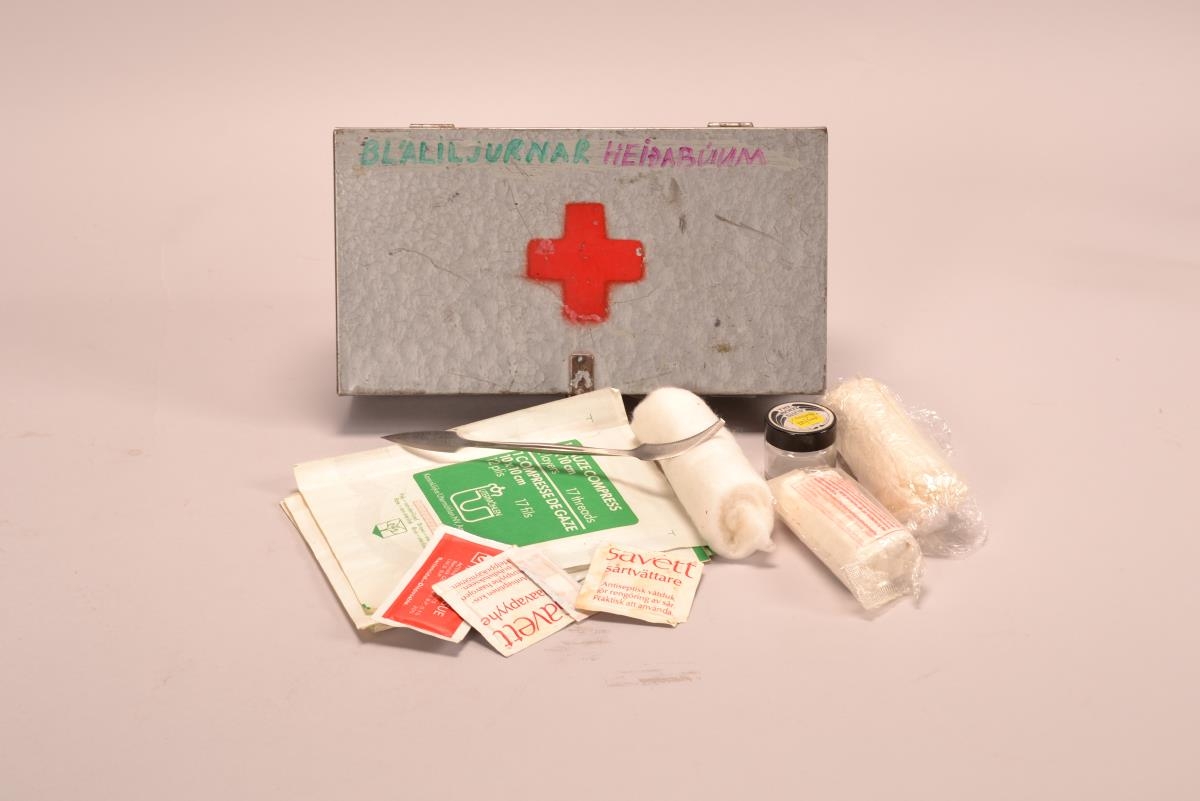 Sjúkrakassi merktur „Bláliljurnar, Heiðarbúar“