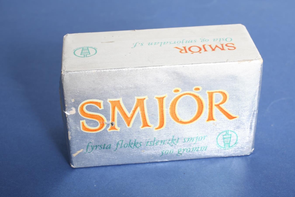 Umbúðir utan af smjöri (500 gr), fyrsta flokks íslenskt smjör. Tvær pakkningar. Síðari er (rauð) utan af sérsöltuðu smjöri. Mjólkurafurðaumbúðir frá Mjólkurstöð Kaupfélags Héraðsbúa.
