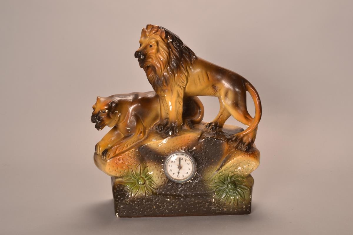 Borðklukka. Stytta af ljónspari með innfelldri upptrekktri klukku. Á bakhlið er greipt talan „657“