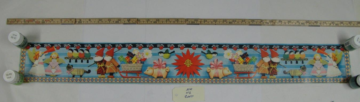 Ljósblár renningur til að hafa á vegg. Mynd af englum, jólasveinum, fuglum, köttum, grísum og af krökkum með pakka. Var í eigu Sigríðar Jóhannsdóttur Kröyer og Sveins Guðmundssonar rafvirkjameistara.