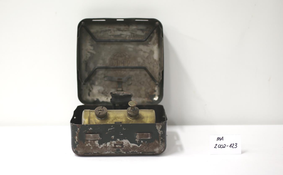Svartur bensínprímus í álkassa. Optimus (í merki) og OPTIMUS No. 11 stendur á lokinu. Í kassanum eru lítill gaskútur (brass), tappi, lítill skiptilykill og grind. Fannst á háalofti á Laufási 1, Egilsstöðum. Vilhjálmur Einarsson, sem ólst upp í húsinu, gefandi telur að yngri bróðir sinn, Stefán Einarsson (fæddur 1940) hafi átt gripinn. Notaður til upphitunar matar í útilegum.