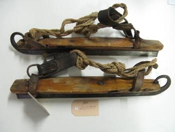 Skautar úr tré, járni og leðri. Eigandi Einar Stefánsson, Laufási á Egilsstöðum.