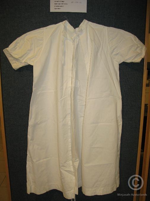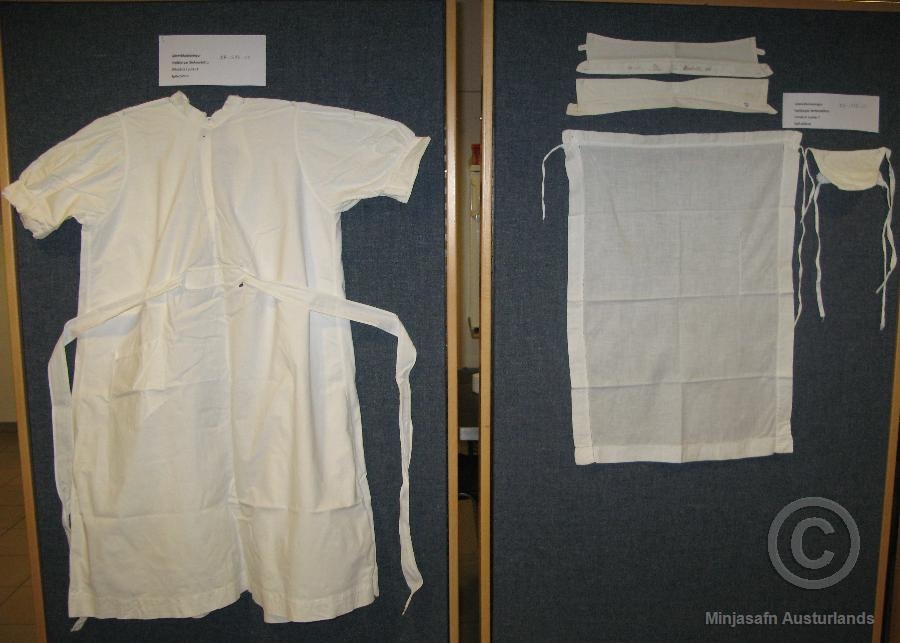 Hvítur sloppur með púffermum, höfuðklútur og grisja fyrir munninn. Einnig tveir lausir kragar/kappar með. Gefandi var ljósmóðir í Fellahreppi. Lærði 1941-1942.