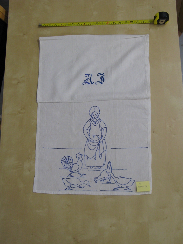 Hvít, útsaumuð mynd með bláum aftursting, merkt "A.J.", Aðalheiður Jónsdóttir. Hún var eina af systkinunum á Höfða, handklæðið er úr þeirra búi.