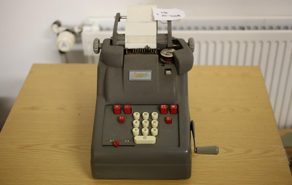 Grá reiknivél með pappírsstrimli. Með hvítum og rauðum tökkum. Tegund: Addo - X. Framleiðandi: A.B. Addo - Malmö. Made in Sweden. Úr dánarbúi Gunnsteins Stefánssonar (f.23.06.1930, d. 10.01.1986), vatnamælingamanni frá Ekru og Huldu Jónsdóttur (f. 15.04.1931, d. 06.02.2004) húsmóður frá Freyshólum, sem bjuggu á Selási 5 á Egilsstöðum (Hulda var afasystir gefanda).