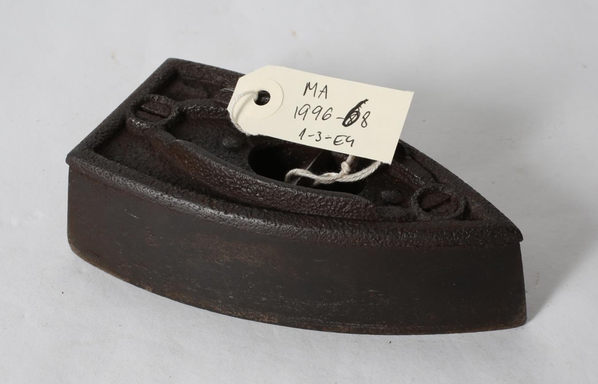 Úr þriggja járna setti. Hald og standur. Straujárn MA-1996-68a og b en standur merktur c. Úr eigu Hallberu Daníelsdóttur frá Gili í Norðfirði, tengdamóður Þorsteins Sigurðssonar læknis og ömmu gefanda.