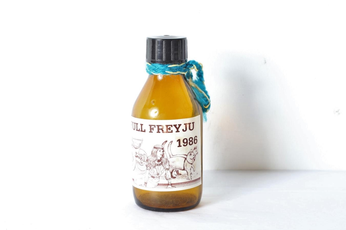 Lítil brún flaska (150 ml) með svörtum plast tappa og hvítum álímdum miða sem á er prentað með brúnu: "Full Freyju 1986" og mynd af Freyju, vagni hennar og köttunum sem draga hann. Um háls flöskunnar er bundið band. Það er snúið saman úr gulu og grænbláu bandi.