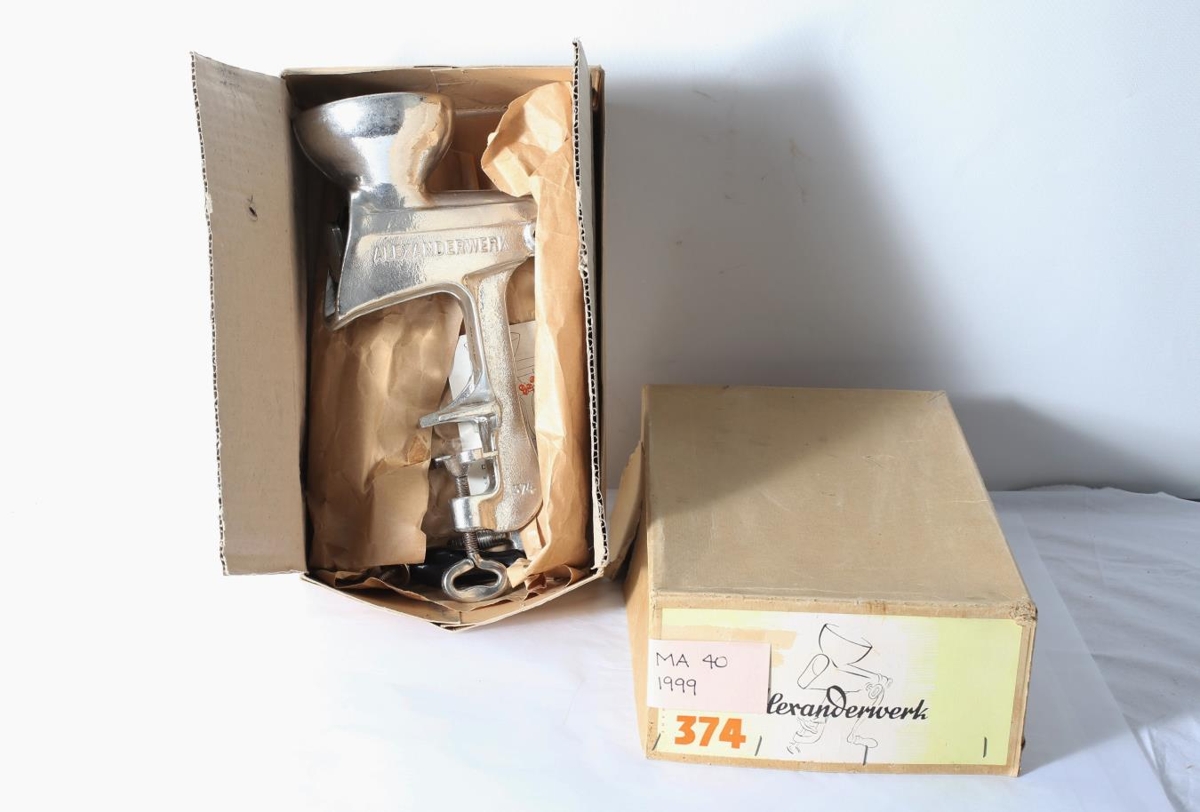 Silfurlituð Alexandermerk berjapressa. Pressan er mötuð að ofan og sveif stendur aftur úr pressunni. Snúið til að pressa berin.