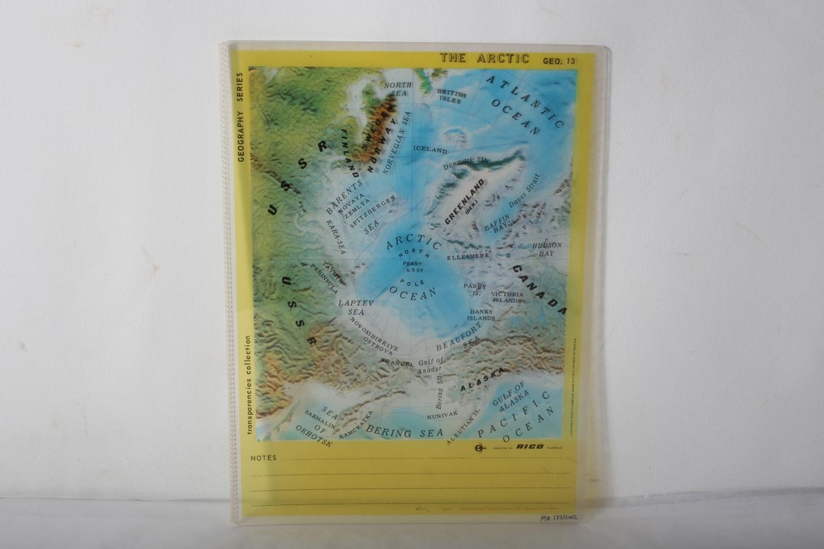 Glæra í lit ætluð til kennslu í landafræði. Glæran heitir: Geography series The Arctic GEO.13". Landakort af landslagi norður heimsskautasvæðisins. Helstu staðarnöfn og nöfn ríkja eru merkt inn á kortið ásamt hæð fjalla. Textinn er á ensku. Hægt er að fletta glærunni í sundur og sýna fyrst kortið og leggja textann svo ofan á.