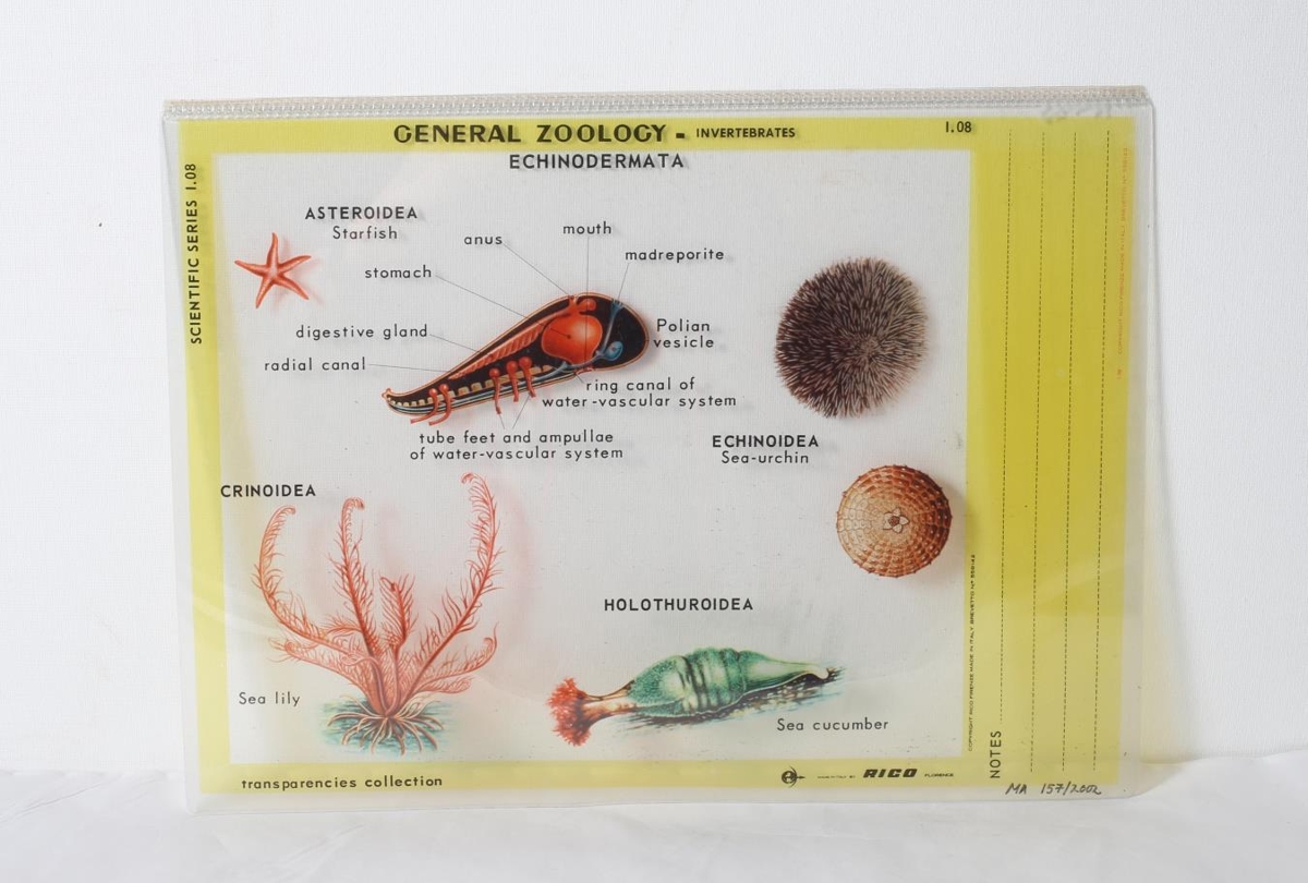 Glæra til kennslu í náttúru-/líffræði. Glæran heitir: "General Zoology invertebrates Echinodermata I.08". Á glærunni er m.a. verið að lýsa krossfiski og ígulkeri. Hægt er að fletta glærunni í sundur og sýna bara myndirnar. Frá Alþýðuskólanum á Eiðum.