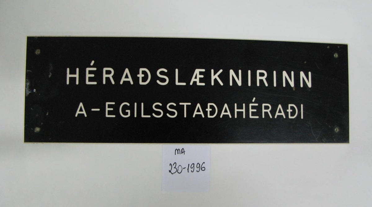 Héraðslæknirinn A-Egilsstaðahéraði. Hvítir stafir á svörtum grunni. Fylgdi hurð sem gefandi fékk.