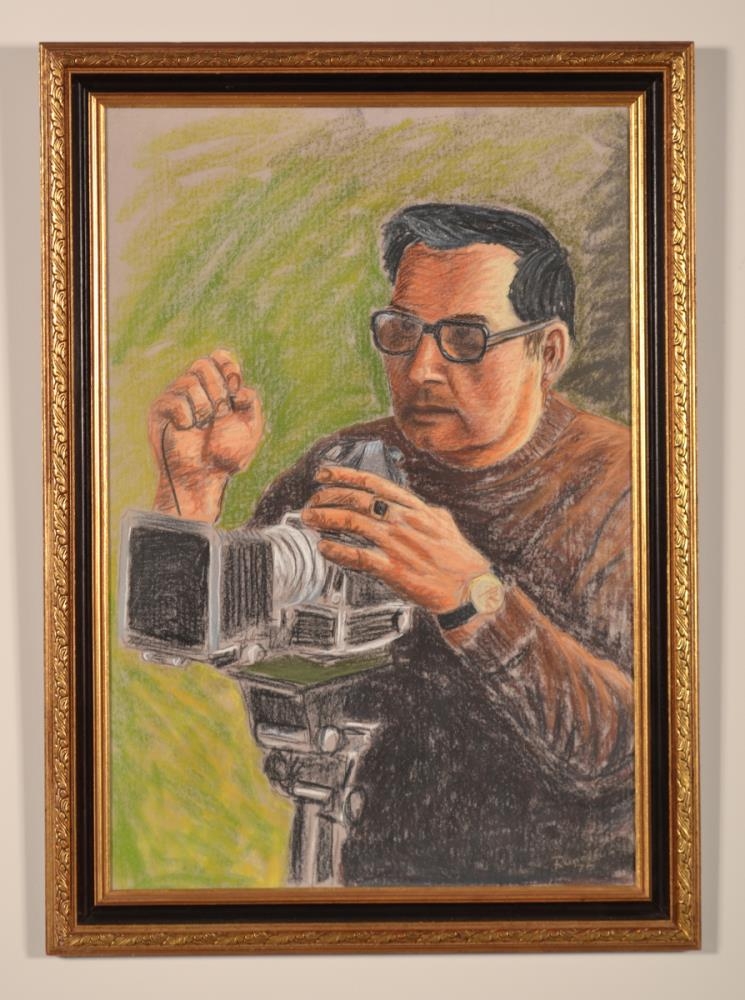 Innrammað málverk af Heimi Stígssyni, ljósmyndara, eftir Runólf frá árinu 1976