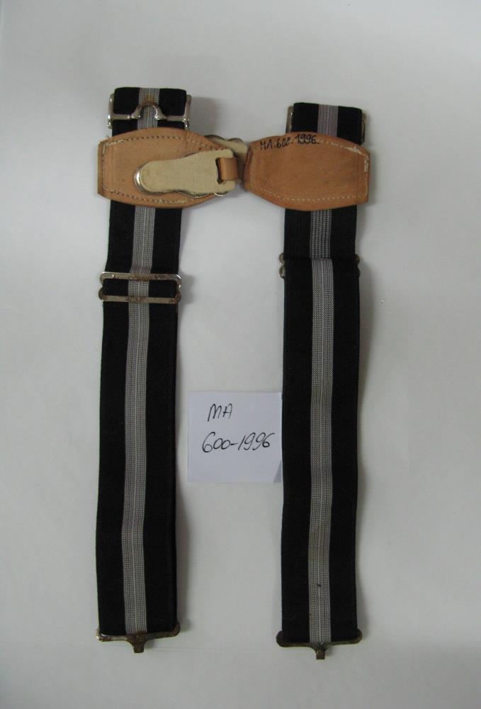 Sokkabönd úr blárri treyju með hvítri rönd eftir miðju. Krómaðar krækjur og svo drapplitt leður sem sokkurinn er festur á. Úr eigu Árna Haraldssonar frá Tandrastöðum í Norðfirði.