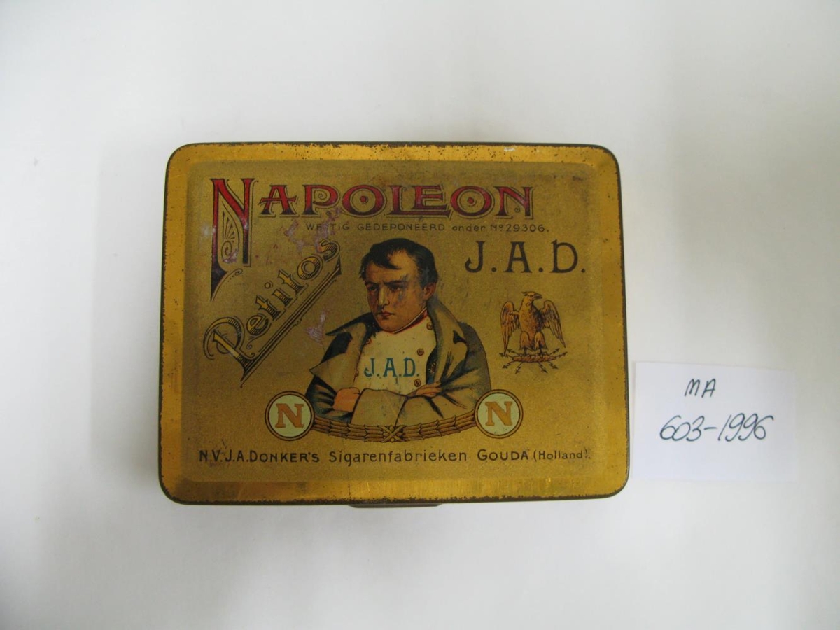 Vindlakassi úr blikki. Teg: Napoleon Petitos, smávindlar. Í öskjunni voru ýmsir smáhlutir sem settir voru hver í sinn flokk. Úr eigu Árna Haraldssonar frá Tandrastöðum í Norðfirði.