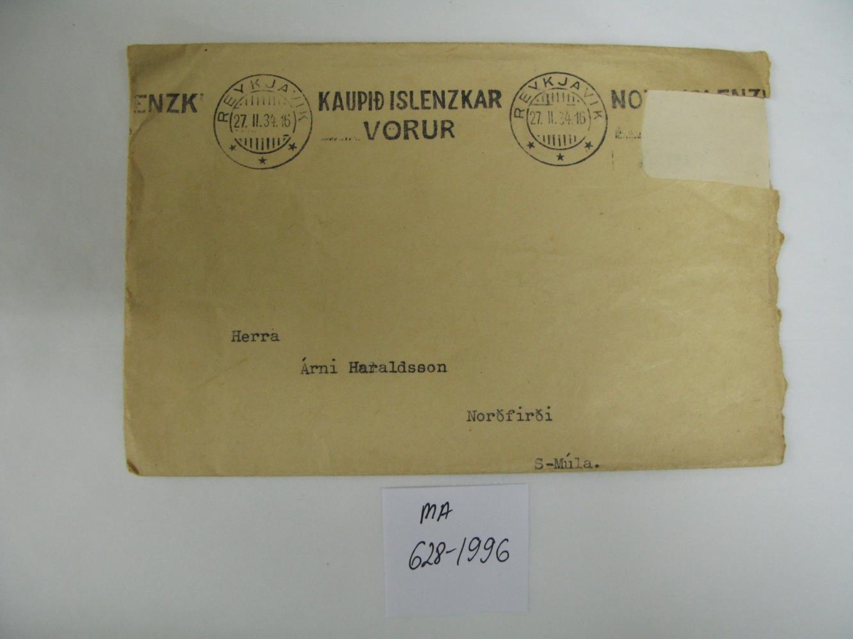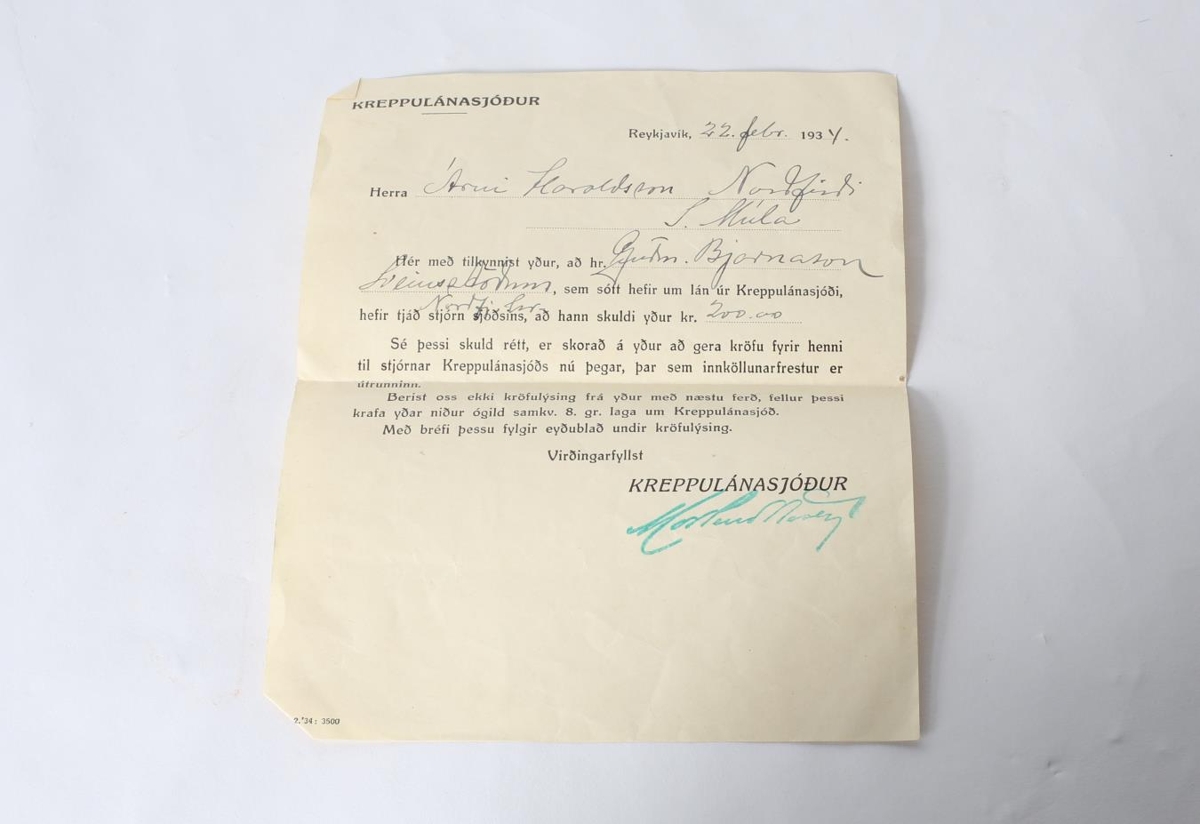 Bréf til Árna Haraldssonar frá Kreppulánasjóði um skuld Guðmundar Bjarnasonar við Árna. Dags: 22.02.1934 í Reykjavík. Búið að klippa frímerkið af umslaginu. Á póststimplinum stendur. "Kaupið íslenskar vörur". Úr eigu Árna Haraldssonar frá Tandrastöðum í Norðfirði.