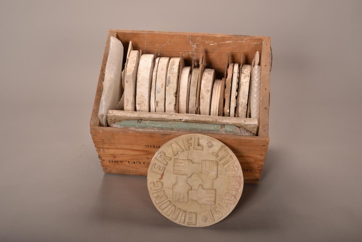 Rauðmálaður trékassi undan smurolíu, Kentár. Í kassanum voru gipsform til að búa til veggplatta,