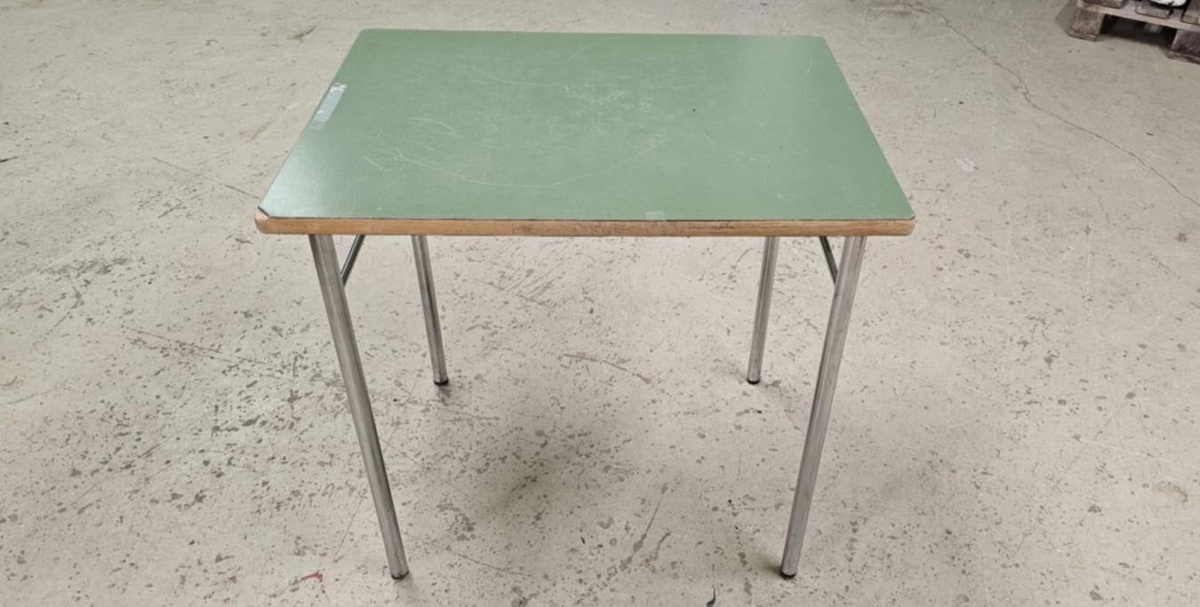 Venjulegt skólaborð með fjórum stálfótum og tréplötu húðaðri með grænu plasti. Platan er dálítið máð og mikið rispuð. Úr eigu Ágústs Guðjónssonar (f.1896) frá Grund í Reyðarfirði, tengdaföður gefanda. Hann hirti borðið úr skólanum á Reyðarfirði þegar fengin voru þangað ný borð.