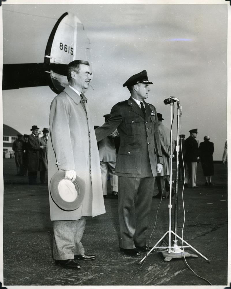 Donald A. Quarles ráðherra Flughersins í heimsókn. John W. White hershöfðingi tekur á móti honum. Við myndina er skrifað: Noted visitors at Keflavik. Secretary of the Air Force, Mr. donald A. Quarles, being greeted by general White during Mr. Quarles' short visit at Keflavik Airport on 12 September 1955.