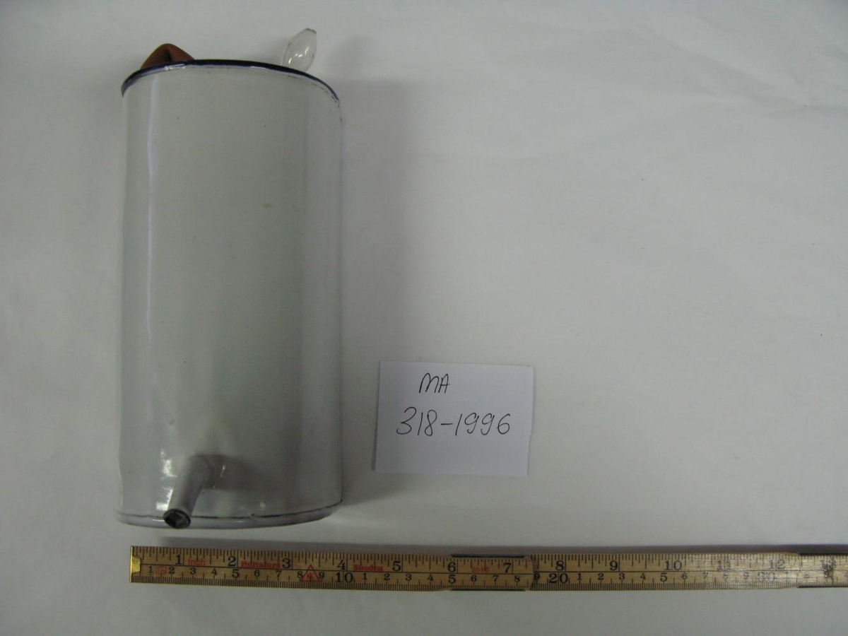 Hvít, emeleruð með rauðri slöngu og glæru plaströri. Frá Dölum í Fáskrúðsfirði.
