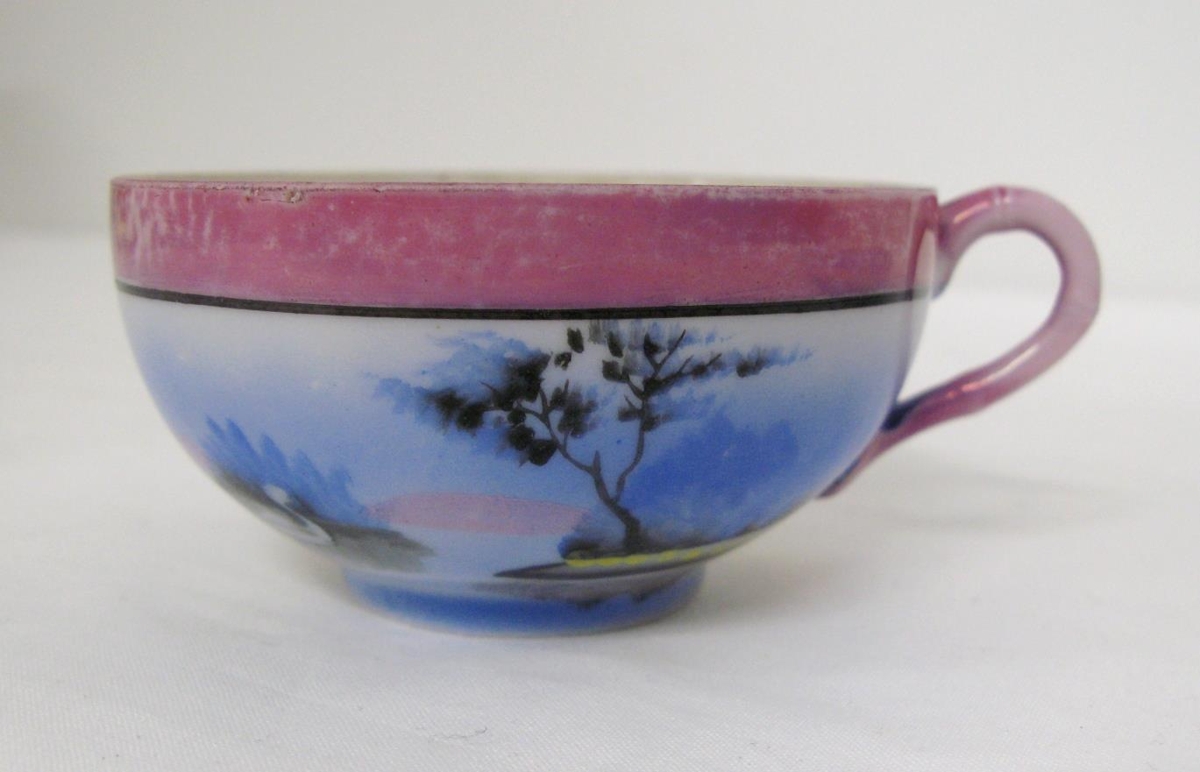 Handmálað postulín. Svanir á tjörn á bláum grunni. Bleik rönd efst. Úr kaffistelli, sambærilegu við mávastellið.