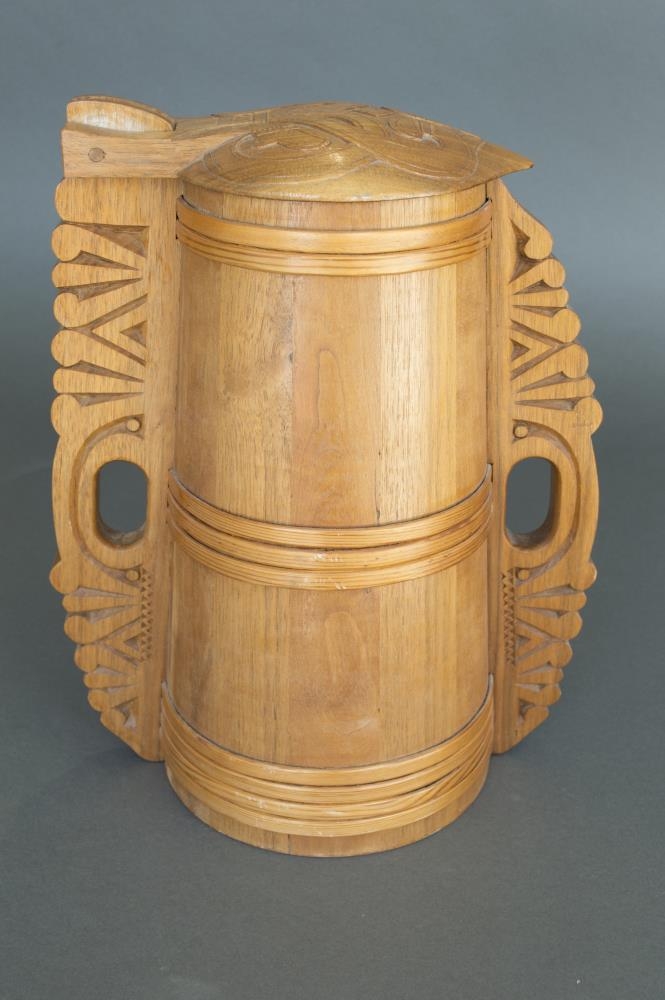 Drykkjarkanna úr tré, af gamalli gerð, smíðuð úr mahoní. Er með skreyttum höldum á hliðum og útskornu loki. Á botni smiðsmerking: HHK og 1982. Hæð 73 cm, þvermál við botn 19 cm við op 14,3 cm. Uppruni er óviss, Ragnar keypti könnuna á basar í Reykjavík.