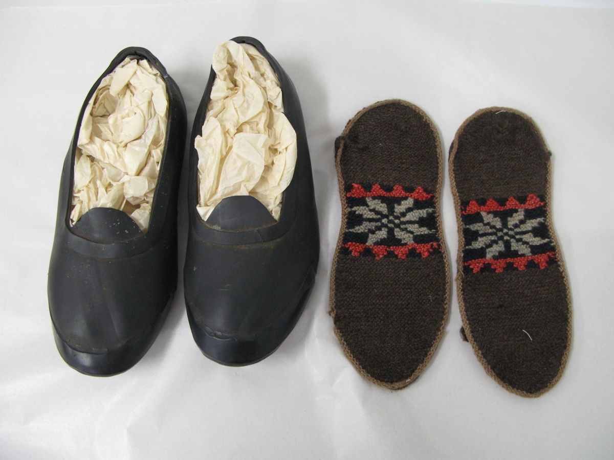 Svartir gúmmískór úr bílaslöngu með tungu. Útprjónaðir rósaleppar fylgja með sem eru orðnir nokkuð slitnir að neðan. Skóna átti Einar Pétursson frá Galtastöðum fram.