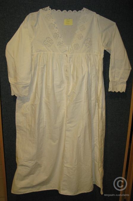 Hvítur náttkjóll með v-hálsmáli sem allt er útsaumað og á boðungunum sitthvoru megin með enskum saum. Úr eigu Helgu Sigurðardóttur, Reykjavík (f.27.09.1891).