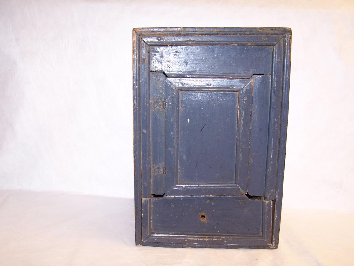 Veggskápur úr tré, blámálaður. Úr búi Ólafs Sigurgeirssonar og Kristínar Bergsdóttur á Syðra-Fjalli 1 í Aðaldal. Skápurinn hékk á vegg, ekki er vitað um smið