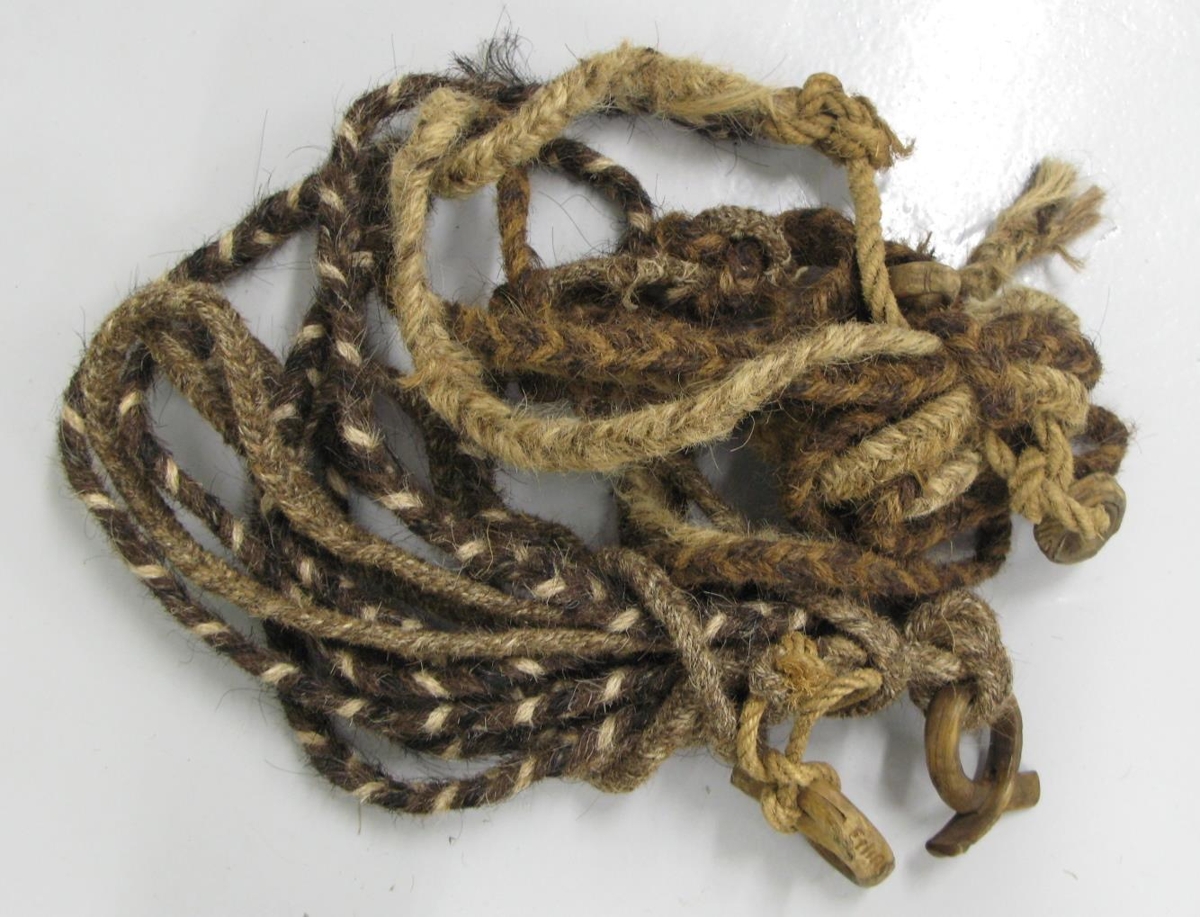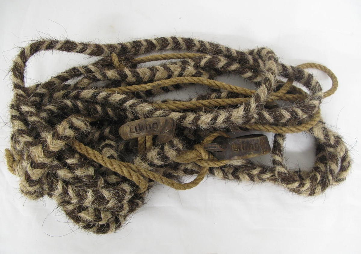 Reipahestur, kaðlar úr fléttuðu hrosshári og með tveimur hornhögldum sem brennimerktar eru með Erling Seli. Hamspotti er í högldunum. Þetta er brennimark Erlings Jónssonar, bónda á Þorgrímsstöðum.