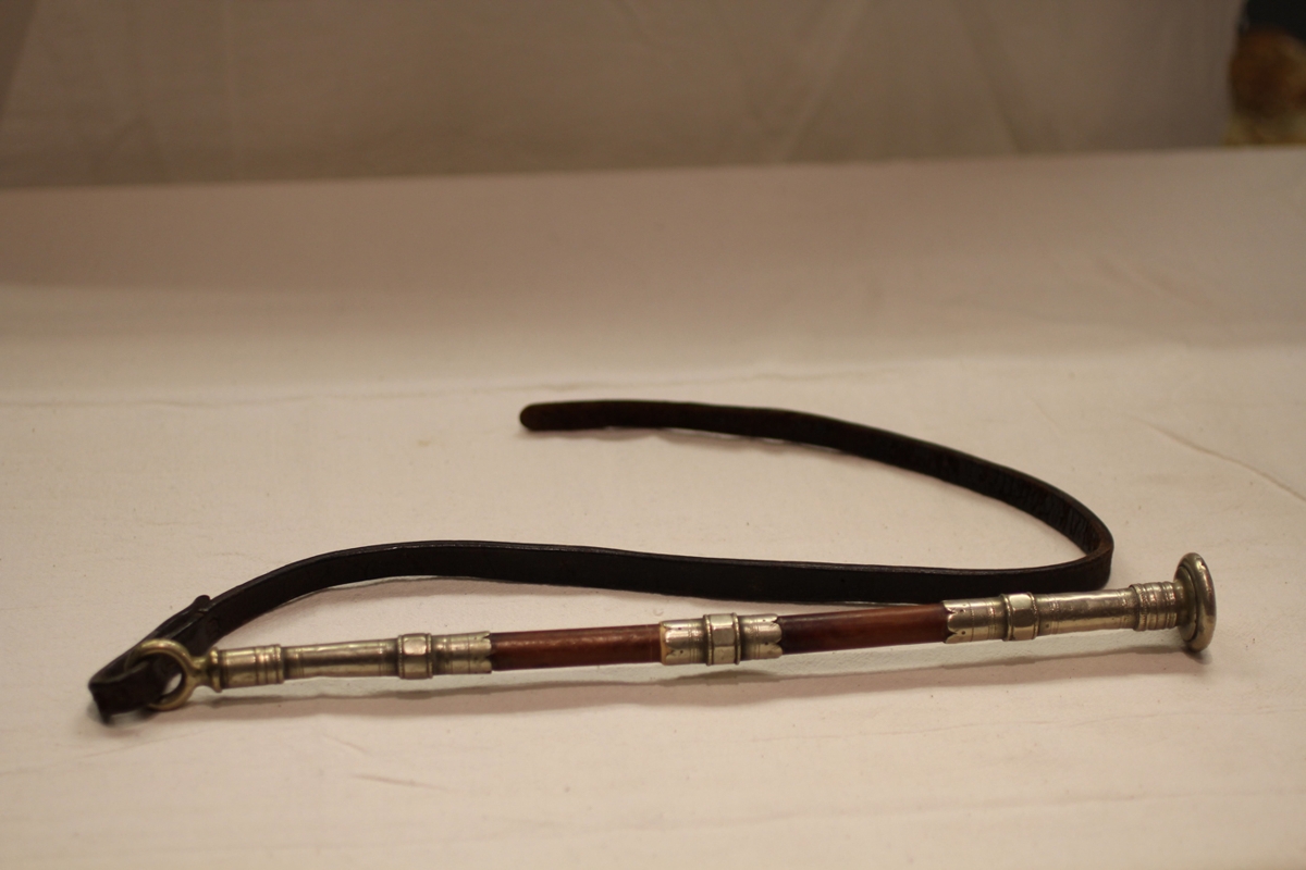Silfurbúin svipa með leðuról, "Jónas" grafið í endann á skaftinu. Úr eigu Jónasar Bóassonar, bónda á Hlíðarenda (Geldingi), afa gefanda. Trúlega smíðuð á Refstað í Vopnafirði. Jónas var fæddur á Stuðlum í Reyðarfirði og var kenndur við Stuðla.