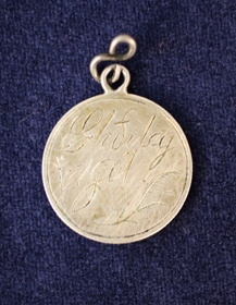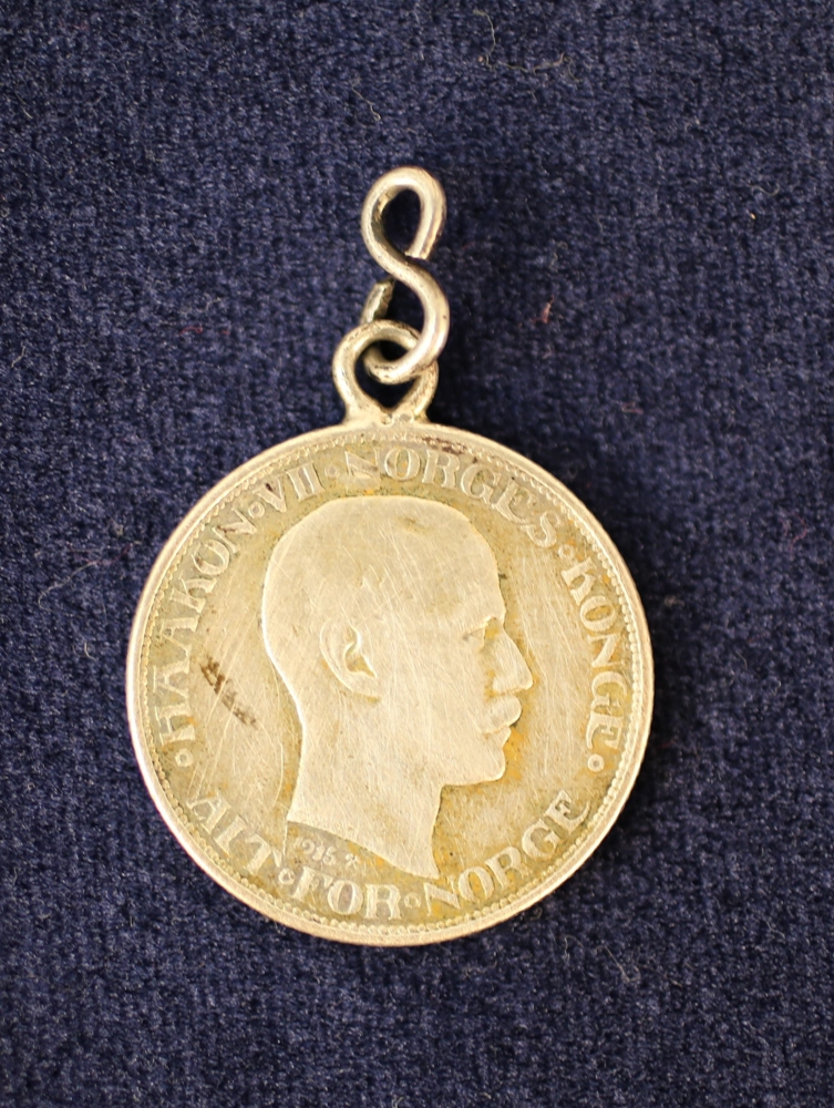 Norsk mynt frá 1915. Á aðra hlið hefur verið sorfinn flötur og grafið á "Gleðileg jól". Úr búi Sigurðar Sigurðssonar. (f.11.11.1849, d.09.03.1923) og Vilborgar Gísladóttur (f.29.08.1864, d.06.12.1929), bænda í Stekkjarhjáleigu.