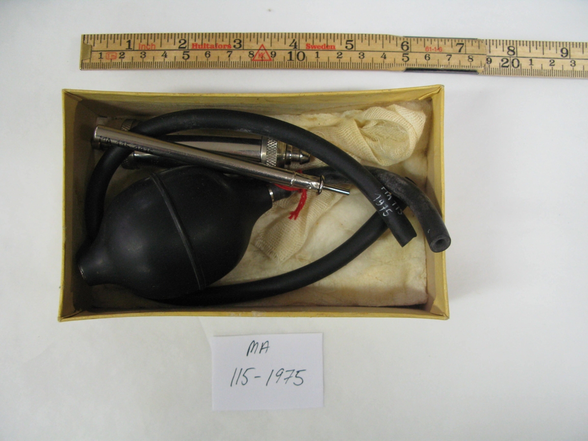 Doðadæla í hvítum kassa með loki. Teg. Harver-Glover. Kansas City Missouri. Dælan krómuð með svartri pumpu og slöngu. Til að lækna doða í kúm með því að dæla lofti inn í júgrið.