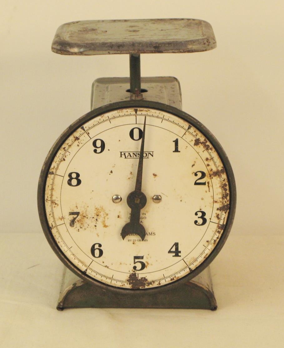Grá og hvít borðvigt af gerðinni Hanson. Grá með hvítri skífu. Ryðblettir.