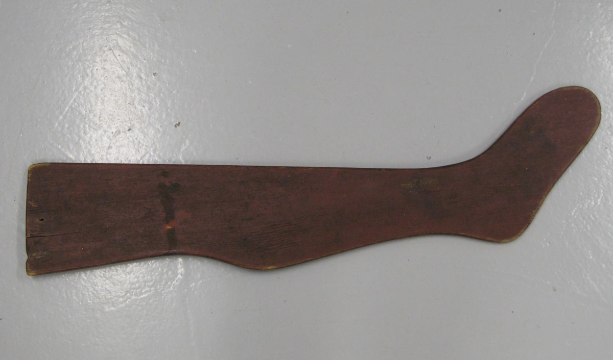 Rauðbrún, þunn fjöl - söguð út eins og sokkur.