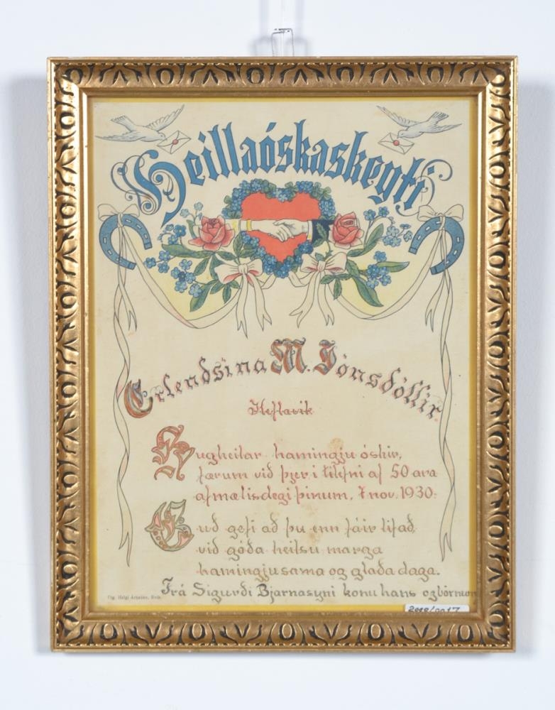 Innrammað, skrautritað heillaóskaskeyti til Erlendsínu M. Jónsdóttur, Keflavík, í tilefni 50 ára afmælis hennar. Skrautritað af Ragnari Guðleifssyni. Skeytið er í gylltum, útskornum ramma.