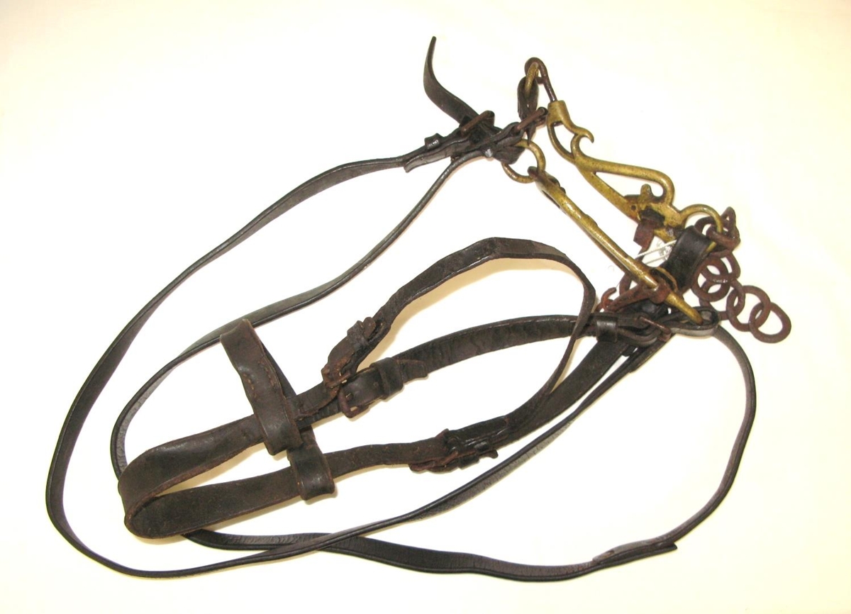 Úr kopar, sigurnagli úr járni. Höfuðleður og kjaftmél fylgja. Mél og stangir smíðaðar af Halli í Berufirði