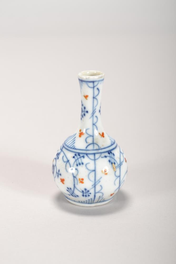 Lítill vasi úr keramiki, hvítur með bláu blómamynstri og bleikum blómadoppum.