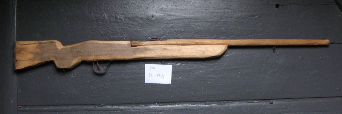 Leikfangabyssa, tálguð úr furu. Nákvæm eftirlíking af "alvörubyssu". Smíðuð af Helga Helgasyni, Péturssonar, fóstur- og bróðursyni gefanda.