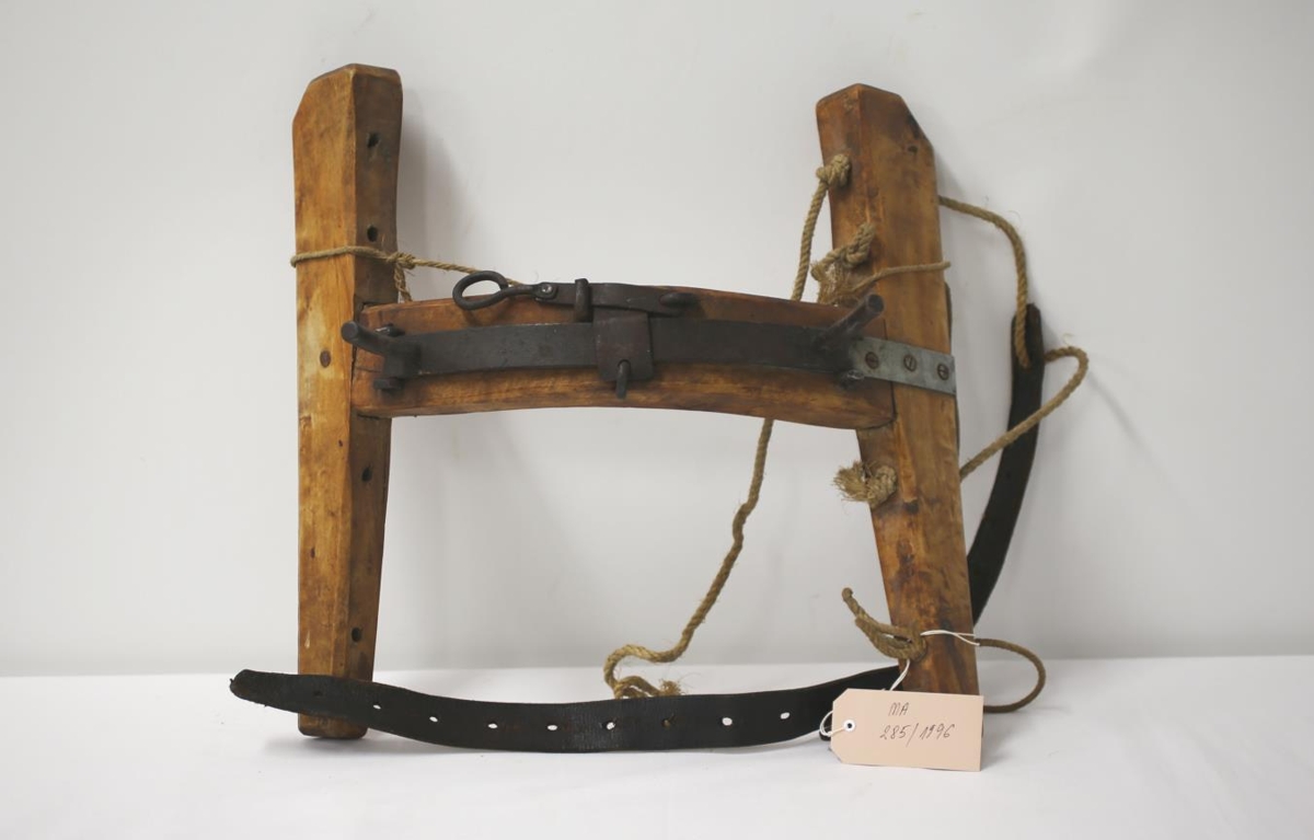 Rauður klyfberi með hleypijárnum. Úr búi Þorsteins Jónssonar (f.20.07.1889, d.13.11.1976) frá Kollsstaðagerði, fyrrverandi kaupfélagsstjóra á Reyðarfirði.