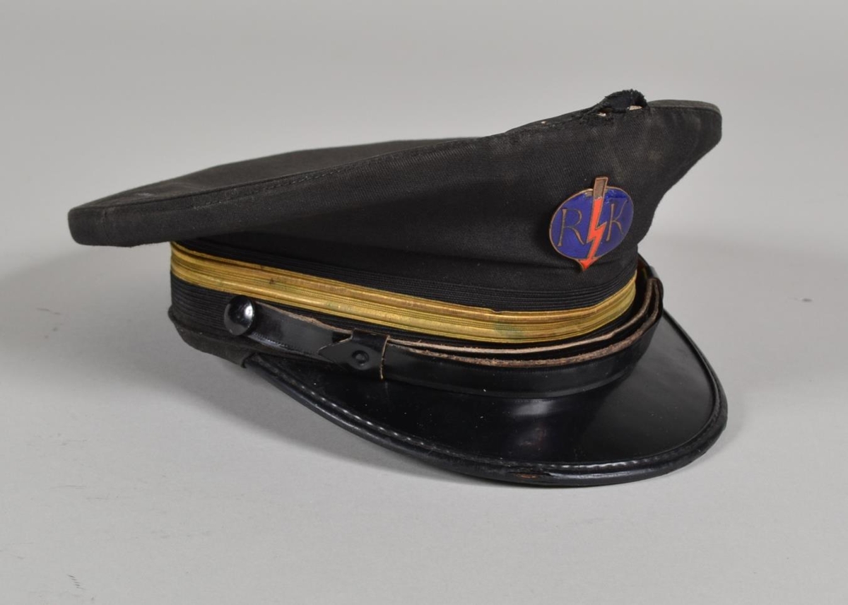 Eeinkennishattur Rafveitu Keflavíkur. Hattur úr svörtu ullarefni með svörtum og gylltum borða úr bómull og málmþræði, fóðruð með svörtu silki, meðfram opi hattsins er brúnt leður og að innan er hvítur leður bútur með miða sem á stendur „P. Eyfeld Húfugerð-Herraverzlun…“. Að framan í miðjunni er merki rafveitunnar RK með eldingu á milli, líklega Rafveita Keflavíkur, derið og ólin eru úr svörtu plastefni.