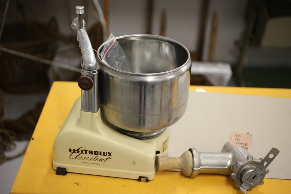 Gul rafmagnshrærivél af gerðinni Electrolux Assistant með lausri járnskál og aukabúnaði til að hakka með. Merkt A. Haus til að hakka, merktur B. Trekt á hakkhaus, merkt C. Gefandi var Ingibjörg Rósa Þórðardóttir (f.1954 - d.2014).