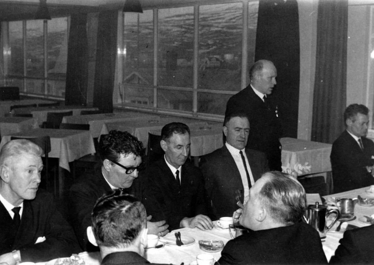 Samsæti Mjólkursamlags KEA, Jónas Kristjánsson kvaddur, og Vernharð Sveinsson tekur við sem mjólkurbústjóri. Árni Jóhannesson ávarpar starfsfólk og gesti.