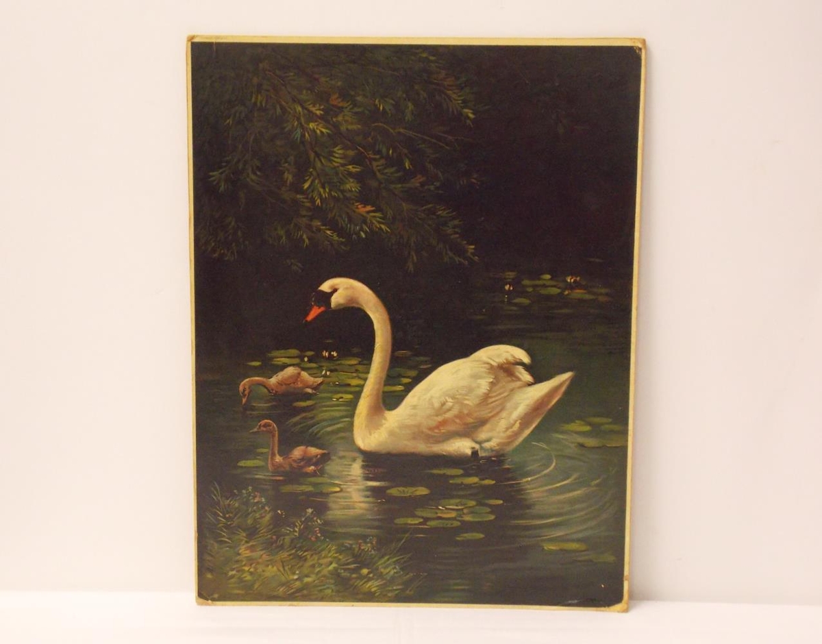 Eftirprentun. Mynd af svani á tjörn með tvo unga. Aftan á myndina er skrifað með blýanti "Vigfús Sigurðsson" Hún er límd á pappa og band til að hengja hana upp límt aftan á hana. Úr eigu Sigurðar Vigfússonar, sonar Vigfúsar Sigurðssonar ljósmyndara m.m frá Egilsstöðum í Fljótsdal.